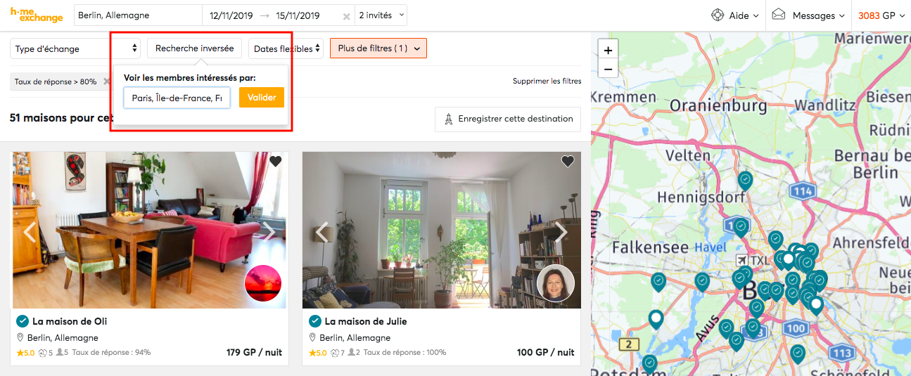Nous avons également mis en place un nouveau filtre “type d’échange” qui vous permet d’affiner vos recherches en précisant “accueil contre GuestPoints” ou “échanges réciproques uniquement”.