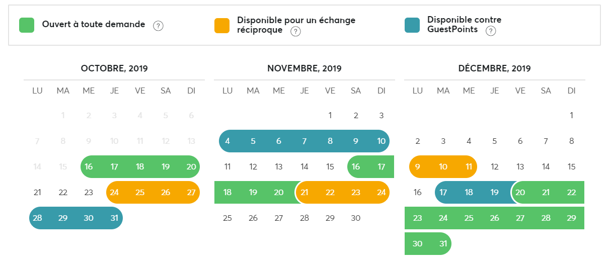 Grâce à vos retours, nous avons compris qu’avoir deux options dans le calendrier indiquant que vous cherchiez un échange contre GuestPoints ou tout type d’échange n’était pas suffisant pour que vous puissiez trouver chaussure à votre pied. Nous avons donc ajouté une nouvelle couleur qui indique les dates auxquelles vous recherchez un échange réciproque (c’est-à-dire que vous souhaitez aller chez votre partenaire d’échange en même temps que vous l’accueillez chez vous).