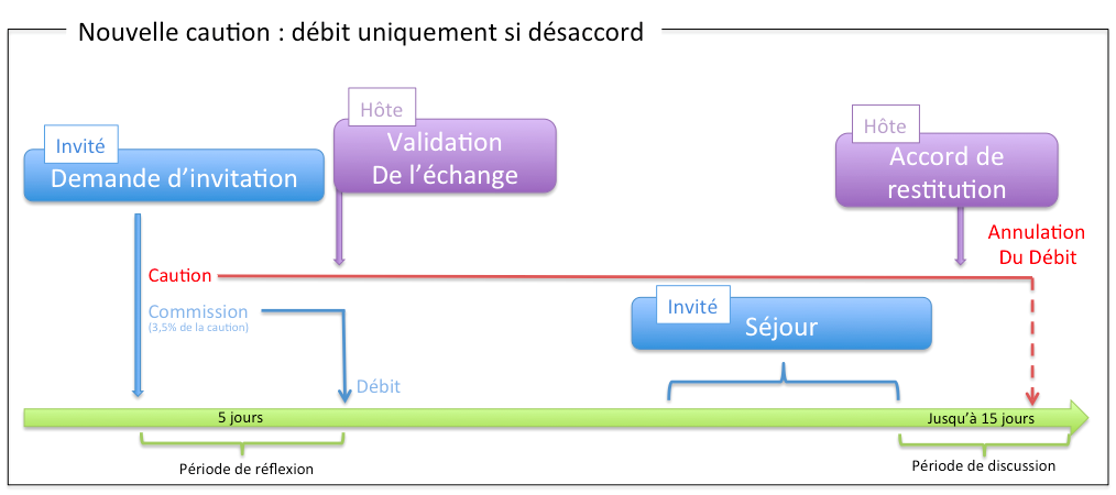 Comme avant, lors du paiement, l’invité s’engage à régler la commission et la caution. La commission est alors débitée dès acceptation de l’échange. En revanche, la caution n’est débitée que 15 jours après la fin du séjour.