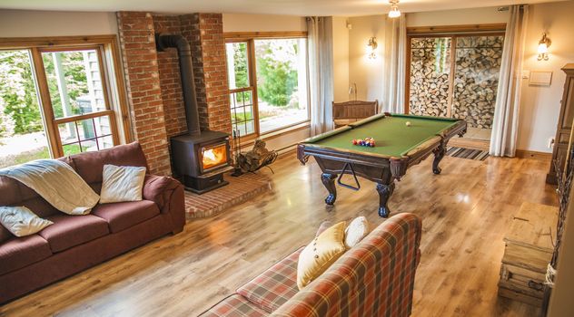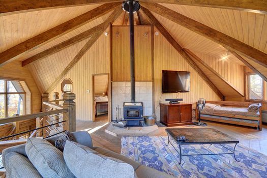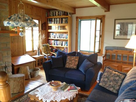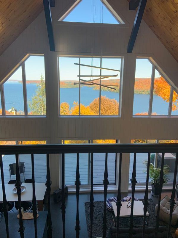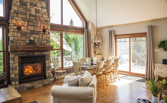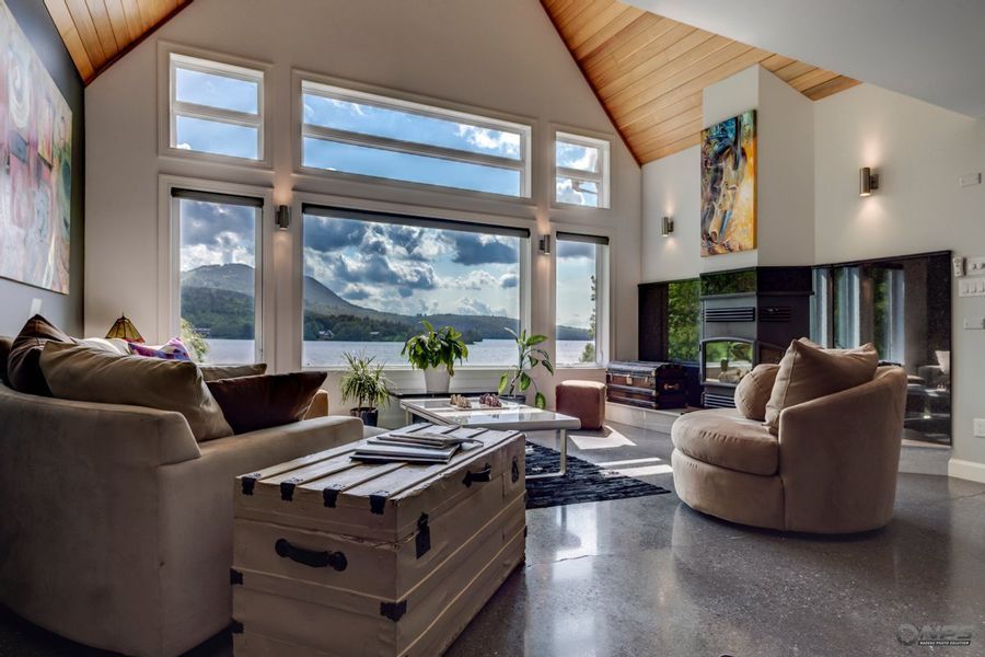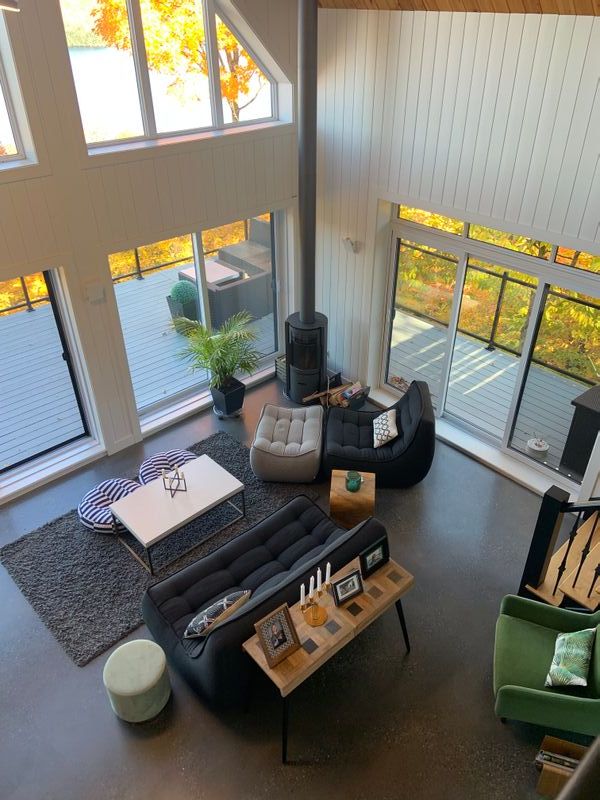 Architecture unique... Fenestration pleine hauteur, plafond cathédrale et foyer au bois avec mur de pierres... une ambiance chaleureuse au coeur de la nature avec une vue sur le fleuve St-Laurent et les montagnes... charme à coup sûr !